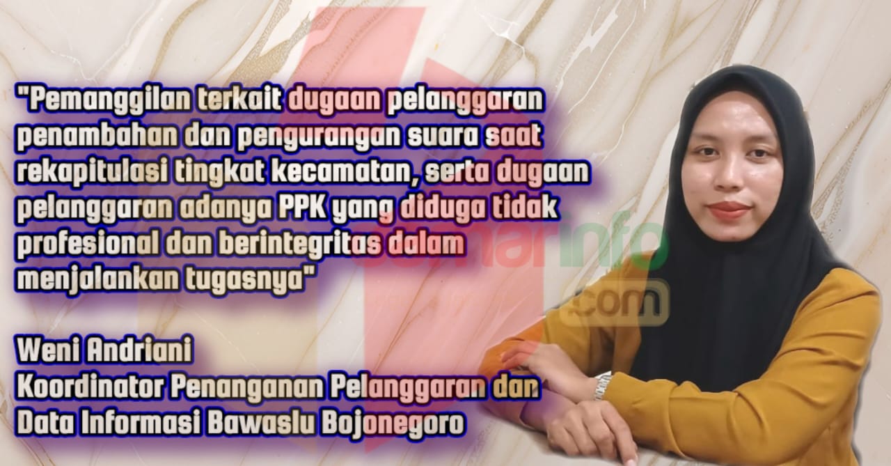 Komisioner Bawaslu Bojonegoro Koordinator Penanganan Pelanggaran dan Data Informasi Weni Andriani mengatakan, pemanggilan terkait dugaan pelanggaran penambahan dan pengurangan suara saat rekapitulasi tingkat kecamatan, serta dugaan pelanggaran adanya PPK yang diduga tidak profesional dan berintegritas dalam menjalankan tugasnya.