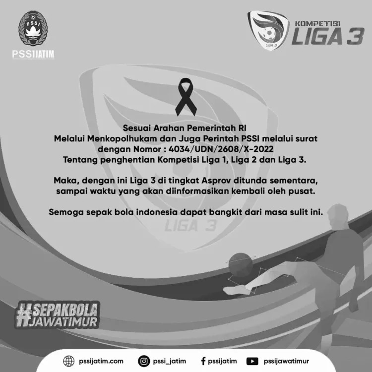Dalam banner yang ditampilkan Asprov PSSI Jatim menyampaikan bahwa sesuai arahan dari Pemerintah melalui Menkopolhukam dan juga surat dari PSSI dengan nomor 4034/UDN/2608/X-2022, Tentang Penghentian Kompetisi Liga 1, Liga 2 dan Liga 3. Maka dengan ini Liga 3 di tingkat Asprov Jatim ditunda sementara hingga batas waktu yang akan diinformasikan kembali oleh pusat