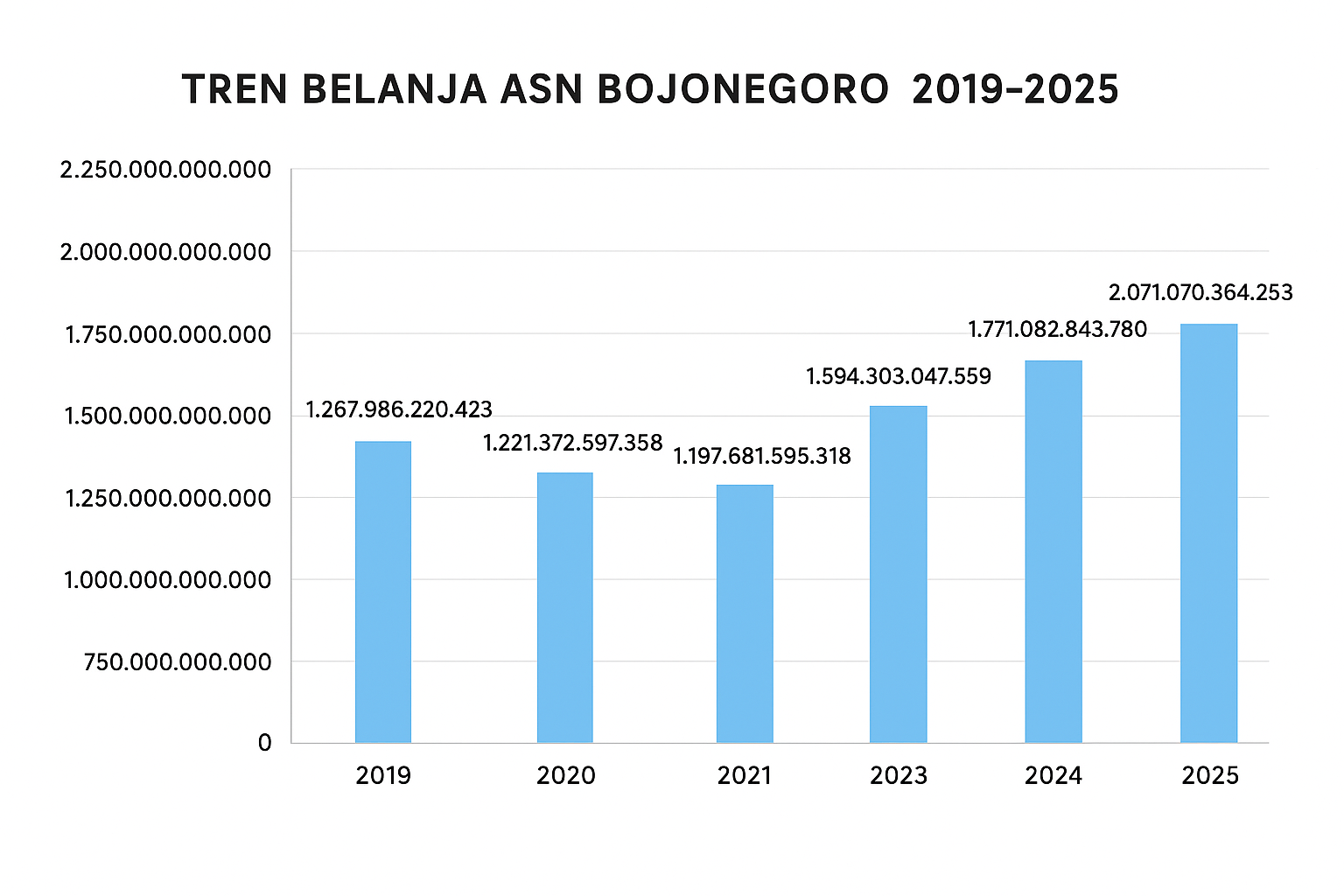 Kemarahan Bupati terasa beralasan. Belanja pegawai ASN di Bojonegoro terus membengkak dalam beberapa tahun terakhir. Data Anggaran Pendapatan dan Belanja Daerah (APBD) menunjukkan tren kenaikan yang signifikan. Pada 2019, belanja ASN tercatat sebesar Rp1,26 triliun. Angka itu sempat fluktuatif, namun sejak 2023 terus menanjak hingga mencapai Rp2,07 triliun pada 2025.