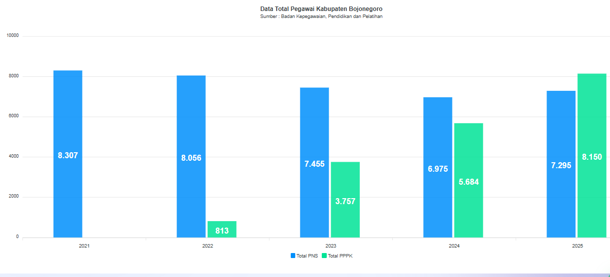 Jumlah ASN Bojonegoro memang melonjak tajam dalam lima tahun terakhir. Data Badan Kepegawaian, Pendidikan, dan Pelatihan (BKPP) mencatat, pada 2021 hanya terdapat 8.307 ASN, sementara pada 2025 jumlahnya mencapai 15.445 orang.