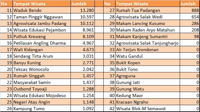 Berikut 10 Destinasi Wisata yang Paling Banyak Dikunjungi di Bojonegoro. Nomor 9 Sejuk Sekali 23 Januari 2023oleh Redaksi 287 Dilihatoleh Redaksi (Tempat Wisata Growgoland, Ngunut, Dander Bojonegoro. Foto : website Desa Ngunut) (Tabel Pengunjung Wisata di Bojonegoro tahun 2022. data diolah dari data.bojonegorokab.go.id) Penulis : Syafik Laman sebelumnya Halaman: 1 2Baca Juga : Menteri Desa Kunjungi Desa Pejambon Bojonegoro Berita TerkaitImmoderma Pionirkan Kecantikan Holistik lewat Kampanye “Cantik dari Hati” di BojonegoroGema Hari Jadi Bojonegoro ke-348: Momen Refleksi dan Kolektivitas Menuju Bojonegoro yang Bersinergi untuk MandiriKetua DPRD Bojonegoro Ikuti Prosesi Penyemayaman Api AbadiProsesi Sakral Pengambilan Api Abadi Kayangan Api Warnai HJB ke-348HJB 348 Tanpa Grebeg Berkah, Warga Gelar Tasyakuran di Desa Masing-masing