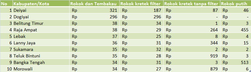 Berikut 10 Kabupaten dengan pengeluaran per kapita per minggu untuk rokok terbesar di Indonesia menurut catatan BPS tahun 2022;
