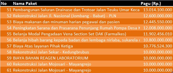 Berikut Proyek-Proyek Jumbo di Bojonegoro Tahun 2023. Masihkah Jadi Penonton? 16 Januari 2023oleh Redaksi 1097 Dilihatoleh Redaksi (Jalan Nasional Bojonegoro - Babat setelah di lakukan pelebara. Foto : Syafik) (Tabel Proyek Pekerjaan dengan Pagu di atas Rp. 10 miliar di Bojonegoro tahun 2023. Data di olah dari laman sirup lkpp) Masihkah orang Bojonegoro menjadi penonton? Baca Juga : Sukur Priyanto Sebut Pemkab Bojonegoro Tidak Tanggap Kondisi MasyarakatPenulis : Syafik Baca Juga : Rancangan P-APBD Kabupaten Bojonegoro Tahun 2023 Mulai Dibahas Laman sebelumnya Halaman: 1 2 3 4 Berita TerkaitBupati Bojonegoro Setyo Wahono Sidak Percepatan Pembangunan dan Disiplin ASNKuliah Praktisi Hukum Unigoro Bahas Perluasan Yurisdiksi Pengadilan Hubungan IndustrialBupati Bojonegoro Setyo Wahono Lantik Edi Susanto Sebagai SekdaDana Bojonegoro di Bank Menggunung, Bukan Hanya di Tahun 2025Rembug Pendidikan: Strategi Wujudkan Pendidikan Bojonegoro Berdaya Saing Global