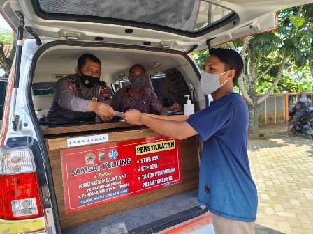 Blora-Satuan Lalu Lintas (Satlantas) bekerja sama dengan UPPD Samsat Blora menggelar Samsat Keliling dan Samsat Desa, Jumat 19-Maret-2021. Samsat Keliling Blora diawaki petugas Satlantas Aipda Saiful Zaeni, dan petugas UPPD Samsat Sunyoto membuka pelayanan pembayaran pajak di kantor Kecamatan Bogorejo.