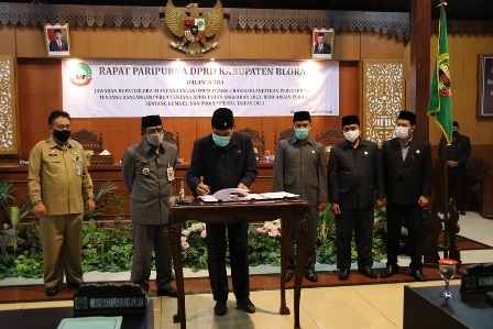 Blora- Melalui pembahasan maraton, rancangan peraturan daerah (ranperda) APBD Blora 2021 akhirnya bisa ditetapkan tepat waktu. Bupati Djoko Nugroho bersama pimpinan DPRD telah menandatangani persetujuan bersama perda APBD Blora 2021 dalam rapat paripurna DPRD, Senin 30-11-2020.