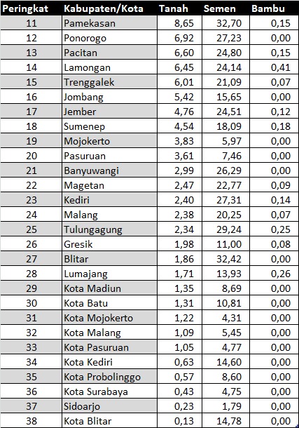 Bojonegoro Juara 1 Persentase Rumah Penduduk Berlantai Tanah se Jawa Timur 13 Juni 202313 Juni 2023oleh Redaksi 309 Dilihatoleh Redaksi (Foto Hasil Aladin. Sumber :Bojonegorokab.go.id) Berikut Persentase Lantai Rumah berbahan Tanah di Kabupaten/Kota Jawa Timur tahun 2022; Baca Juga : Empat Tahun, 15.990 Rumah Diperbaiki dalam Program Bedah Rumah(Tabel Persentase Rumah dengan lantai berbahan tanah di Jawa Timur tahun 2022. Data diolah dari data BPS Jawa Timur) Penulis : Syafik Laman sebelumnya Halaman: 1 2 Berita TerkaitTim Meliwis Putih Unigoro Tembus Final KRTI 2025, Satu-satunya Kampus Swasta Jawa Timur di Ajang Dirgantara NasionalRefleksi Hari Jadi Bojonegoro ke-348, APBD Tinggi, Guru Madrasah TerabaikanLasuri: Dana Bojonegoro di Bank Bukan Ditabung, tapi Strategi Jaga Kesehatan FiskalKetua DPRD Bojonegoro: Kritik Menkeu Jadi Pengingat untuk Bersinergi Wujudkan Bojonegoro MandiriImmoderma Pionirkan Kecantikan Holistik lewat Kampanye “Cantik dari Hati” di Bojonegoro