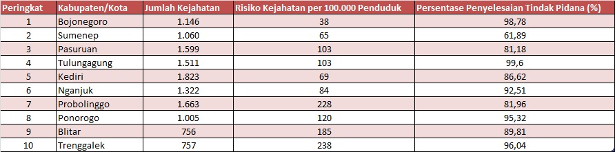 Berikut tabel 10 Kabupaten/Kota Paling Aman di Jawa Timur (2024) berdasarkan data dari BPS Jawa Timur