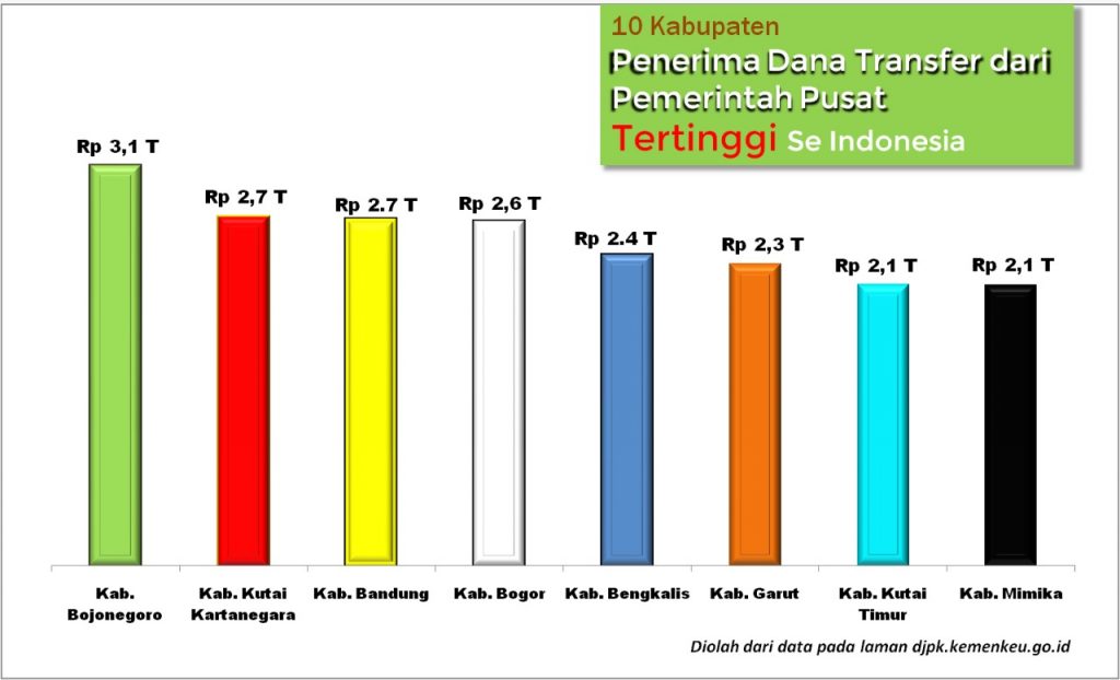 Mengutip laman Direktorat Jendral Perimbangan Keuangan (DJPK) Kementrian Keuangan Republik Indonesia djpk.kemenkeu.go.id (diakses pada 1-2-2022, pukul 21.00 WIB) jumlah keseluruhan dana transfer ke daerah adalah Rp. 596 Triliun. Dengan rincian untuk Pemerintah Provinsi sebesar Rp. 103 Triliun dan untuk Pemerintah Kabupaten/Kota sebesar Rp. 453 Triliun.