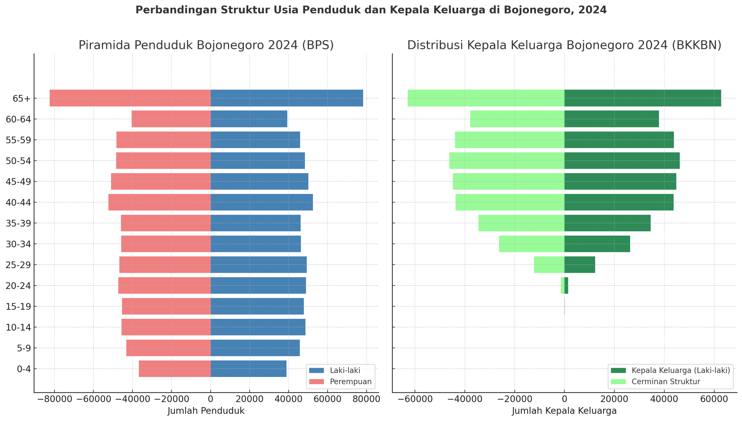 Bojonegoro tahun 2024 memperlihatkan dua sisi wajah demografi. Satu wajah menunjukkan seluruh penduduk — dari bayi hingga lansia — berdasarkan data Badan Pusat Statistik (BPS). Wajah lainnya menyorot para kepala keluarga laki-laki, yang tercatat oleh Badan Kependudukan dan Keluarga Berencana Nasional (BKKBN).