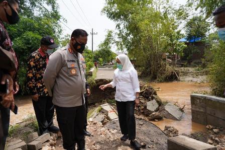 Bupati Bojonegoro Anna Muawanah bersama Kepala Polres Bojonegoro AKBP EG Pandia, serta Kepala Dinas Pekerjaan Umum Sumber Daya Alam SDA, Kepala Dinas PU Bina Marga, Muspika Kecamatan Dander dan Kades Jatiblimbing, meninjau lokasi jembatan yang putus, pada Kamis 21-Januari-2021.