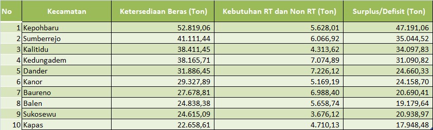Berikut Data Kecamatan dengan ketersediaan beras di Bojonegoro berdasar data dari Dinas Ketahanan Pangan dan Pertanian Kabupaten Bojonegoro dalam laman satu data Bojonegoro. Di awali dengan 10 Kecamatan Terbesar pada tahun 2022 (https://data.bojonegorokab.go.id/dinas-ketahanan-pangan.html@detail=neraca-ketersediaan-beras, diakses tanggal 19-2-2023);