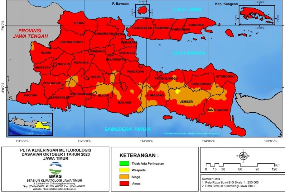 Badan Meterologi dan Klimatologi (BMKG) Jawa Timur memberikan peringatan melalui website resminya https://staklim-jatim.bmkg.go.id/ melalui peta kekeringan meteorologis dasaraian Oktober I tahun 2023. Dari peta peringatan tersebut sebagian besar wilayah Jawa Timur dalam status “Awas” termasuk di Bojonegoro.