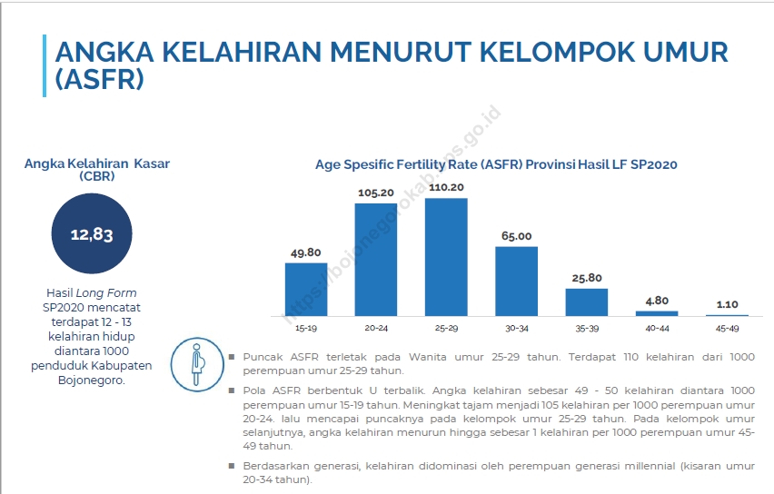 - Angka Kelahiran Menurut Kelompok Umur Tertentu / Age Specific Fertility Rate (ASFR) : Banyaknya kelahiran selama setahun per 1000 perempuan pada kelompok umur 15-49 tahun.