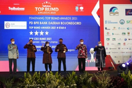 Penghargaan diberikan kepada Bupati Bojonegoro Anna Mu’Awanah sebagai pembina BUMD, Direktur BPR Bank Daerah Bojonegoro Sutarmini sebagai CEO BPR, serta kepada PD. BPR Bank Daerah Bojonegoro sebagai TOP BUMD 2021.