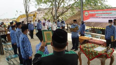 Dengan memakai seragam Korpri, Bupati mengambil sumpah jabatan lima pejabat baru hasil assessment 2020 disaksikan Inspektur Daerah, Asisten Administrasi dan pejabat terkait lainnya tidak jauh dari tumpukan sampah yang menggunung. “Pelantikan di pendopo sudah biasa. Kenapa saya dan Bu Wabup memilih TPA ini untuk melantik? Ya dari momentum inilah kita ingin bersih-bersih. Kita ingin para pejabat yang dilantik ini segera melakukan bersih-bersih, dalam arti perbaikan dan inovasi pemerintahan. Banyak yang harus kita benahi bersama. Kita minta semuanya harus kompak,” tegas bupati.