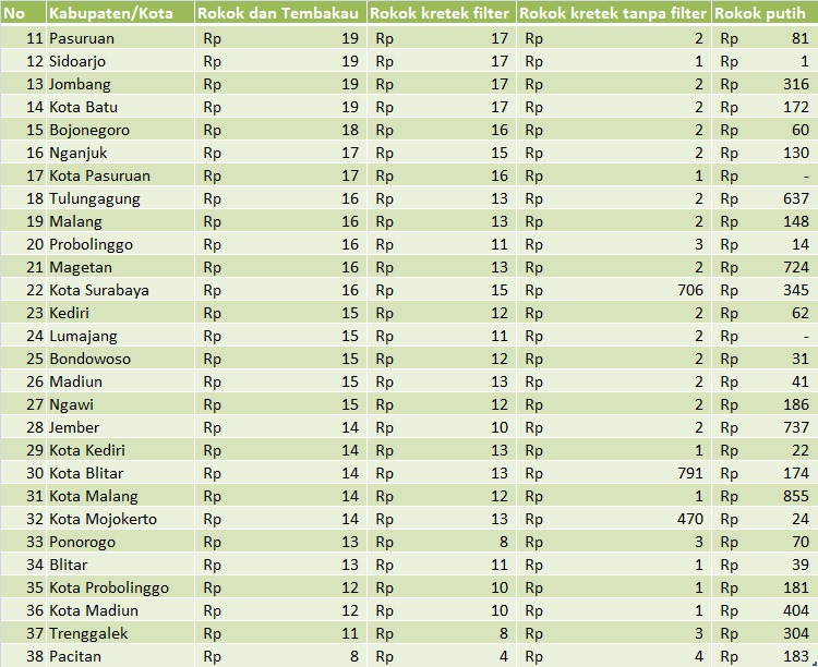 Daerah Mana di Jawa Timur yang Penduduknya Belanja Rokoknya Terbanyak? Berikut Data nya 13 Januari 202313 Januari 2023oleh Redaksi 81 Dilihatoleh Redaksi (Ilustrasi) (Tabel Pengeluaran Per Kapita Per minggu untuk rokok berdasar Kabupaten/Kota di Jawa Timur data diolah ) Penulis : Syafik Laman sebelumnya Halaman: 1 2Baca Juga : Cukai Naik, Rokok Harga Rp 15 Ribuan Jadi Pilihan Berita TerkaitImmoderma Pionirkan Kecantikan Holistik lewat Kampanye “Cantik dari Hati” di BojonegoroGema Hari Jadi Bojonegoro ke-348: Momen Refleksi dan Kolektivitas Menuju Bojonegoro yang Bersinergi untuk MandiriKetua DPRD Bojonegoro Ikuti Prosesi Penyemayaman Api AbadiHJB ke 348, Sally Atyasasmi : Sinergi Menjadi Dasar Untuk KemandirianRangkaian HJB Ke-348, Bupati Bojonegoro Ziarah Leluhur Hingga Penyerahan Bansos Keluarga Kurang Mampu