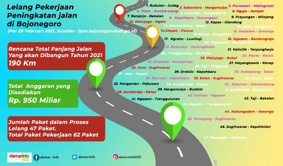Terhitung mulai 28 Februari 2021 tercatat ada 47 pekerjaan peningkatan jalan yang di lelang dari 62 paket pekerjaan yang rencananya dilelang. Melalui website lpse.bojonegorokab.go.id tercatat nilai Harga Perkiraan Sendiri (HPS) terendah dari pekerjaan peningkatan jalan adalah untuk pekerjaan peningkatan jalan pada poros Padangan – Kasiman dengan nilai Rp. 1 miliar. Sementara nilai HPS tertinggi pada pekerjaan ini adalah peningkatan jalan poros Bubulan – Judek dengan nilai Rp. 43,5 miliar.