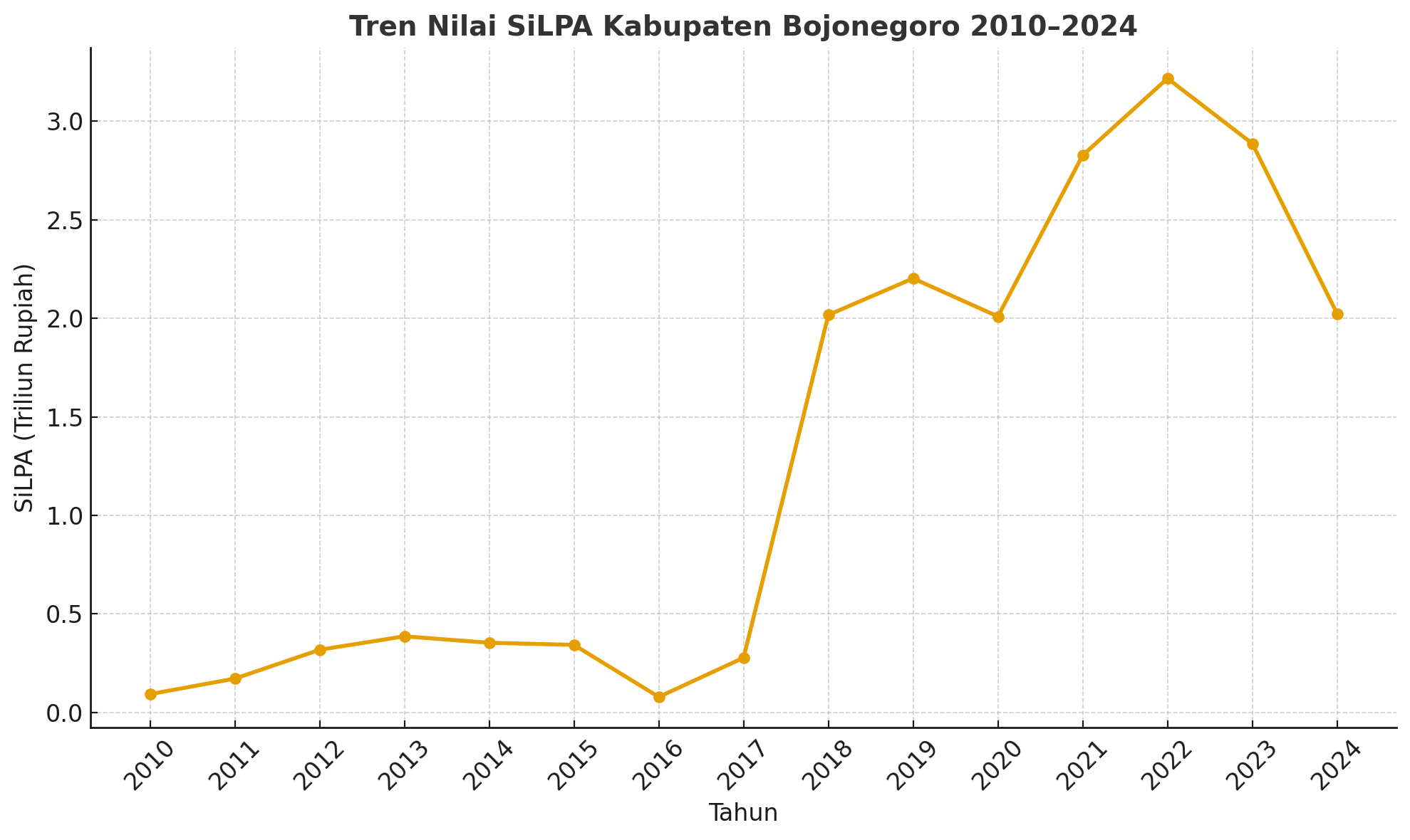 Fenomena dana mengendap di rekening kas daerah Bojonegoro sudah berlangsung lama. Sejak 2018, Sisa Lebih Pembiayaan Anggaran (SiLPA) Bojonegoro nyaris tak pernah di bawah Rp2 triliun.