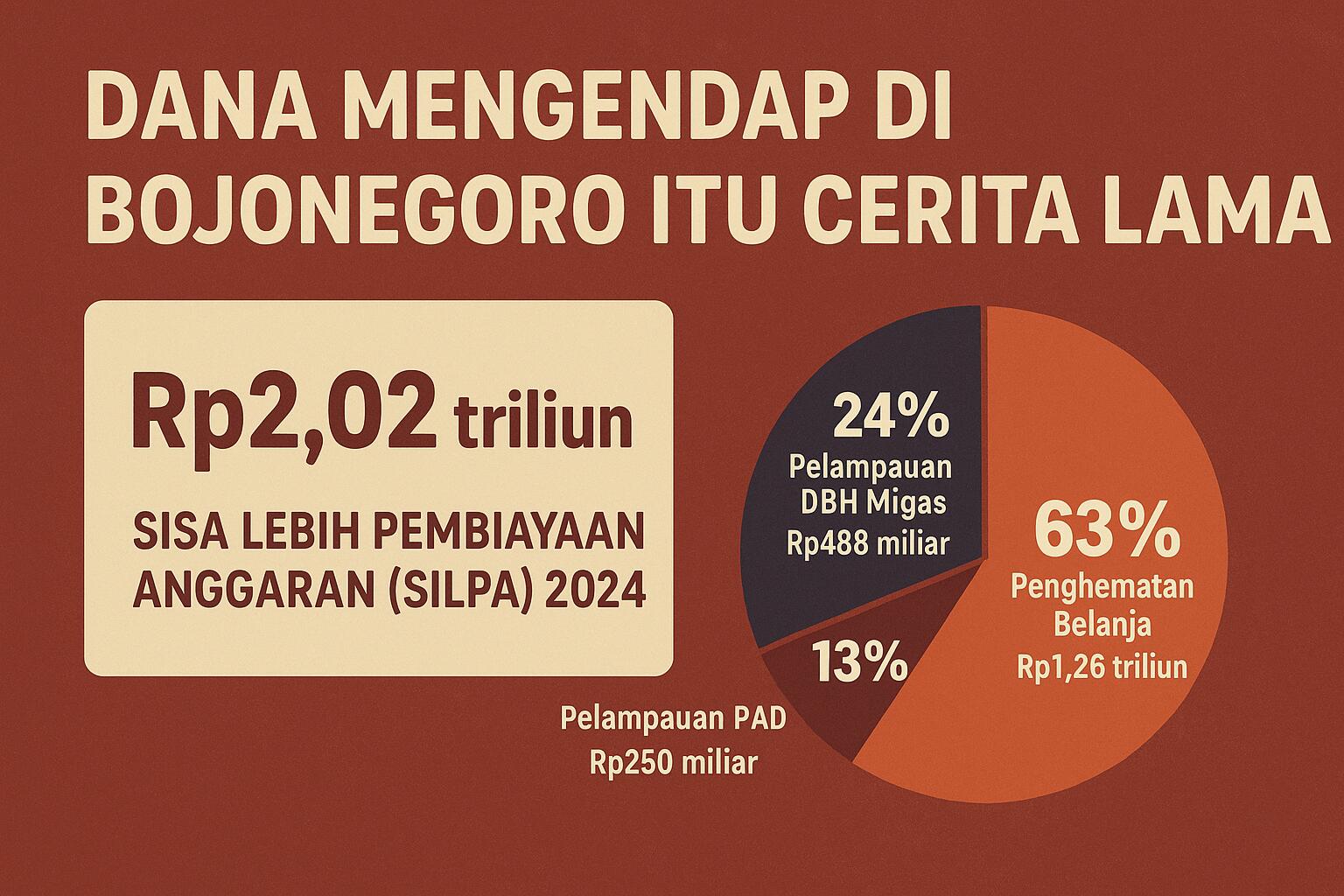 Fenomena dana mengendap di rekening kas daerah Bojonegoro sudah berlangsung lama. Sejak 2018, Sisa Lebih Pembiayaan Anggaran (SiLPA) Bojonegoro nyaris tak pernah di bawah Rp2 triliun.