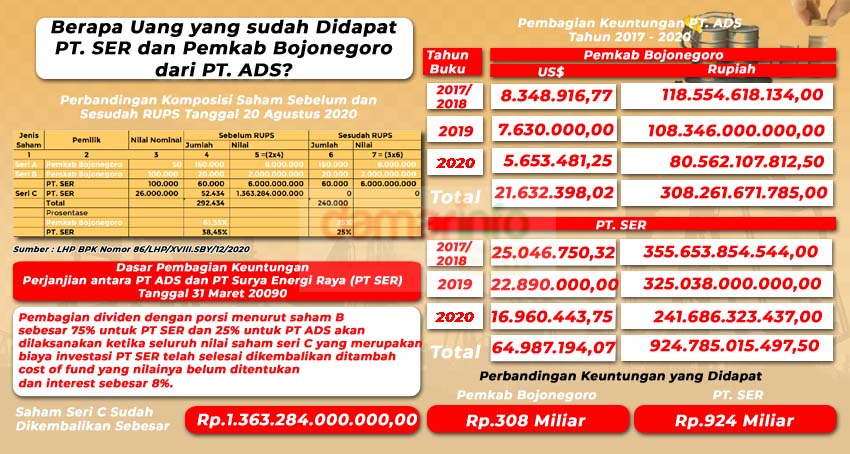 Lalu M. Syahril Majidi menambahkan, bahwa jumlah deviden/keuntungan untuk Pemkab Bojonegoro tahun 2020 adalah sebesar USD 5.653.481 atau setara dengan Rp. Rp.80.562.107.815. Jadi PT. SER mendapatkan US$ 16.960.443,75 atau setara dengan Rp. 241.686.323.437,50.