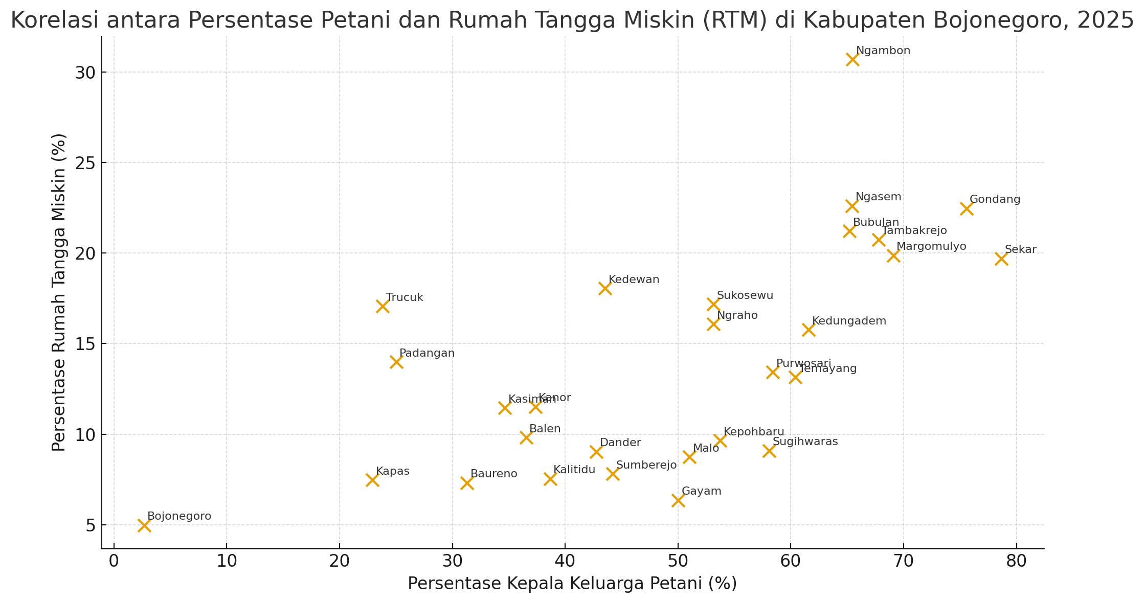 Pola kemiskinan di Bojonegoro memperlihatkan hubungan yang erat antara persentase petani dan tingkat kemiskinan. Wilayah dengan dominasi petani tinggi cenderung memiliki angka rumah tangga miskin lebih besar. Sebaliknya, kecamatan yang lebih urban dan diversifikasi ekonominya lebih luas menunjukkan kemiskinan yang relatif rendah. Berikut gambaran korelasi keduanya: