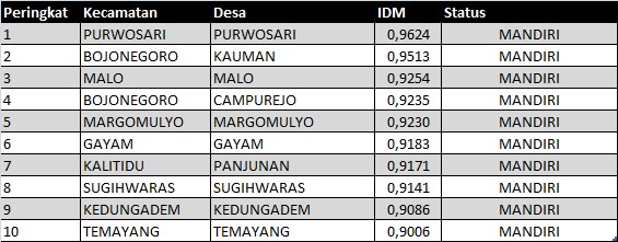 Berikut 30 Desa di Bojonegoro dengan nilai IDM tertinggi pada tahun 2022;