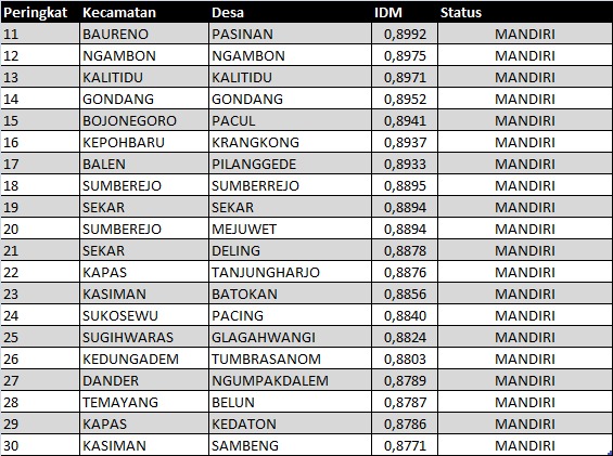 (Tabel IDM Kabupaten Bojonegoro Tahun 2022. Sumber data : ebook peringkat IDM tahun 2022, Kementerian Desa PDTT)
