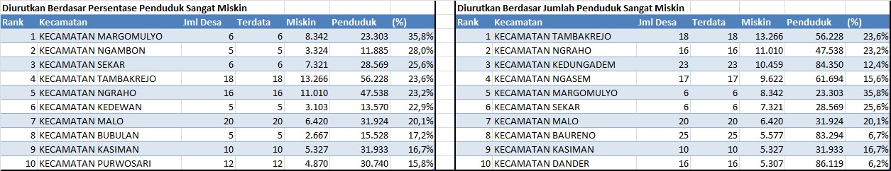 Dari jumlah tersebut, penduduk sangat miskin terbanyak berada di Kecamatan Tambakrejo dengan jumlah penduduk sangat miskin sebanyak `13.266 jiwa dati total jumlah penduduk sebanyak 56.228 jiwa. Berikutnya adalah Kecamatan Ngraho dengan jumlah penduduk sangat miskin sebanyak 11.010 jiwa atau 23,2 persen dari jumlah penduduk Kecamatan Ngraho.