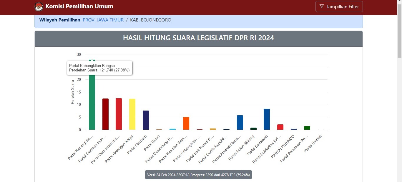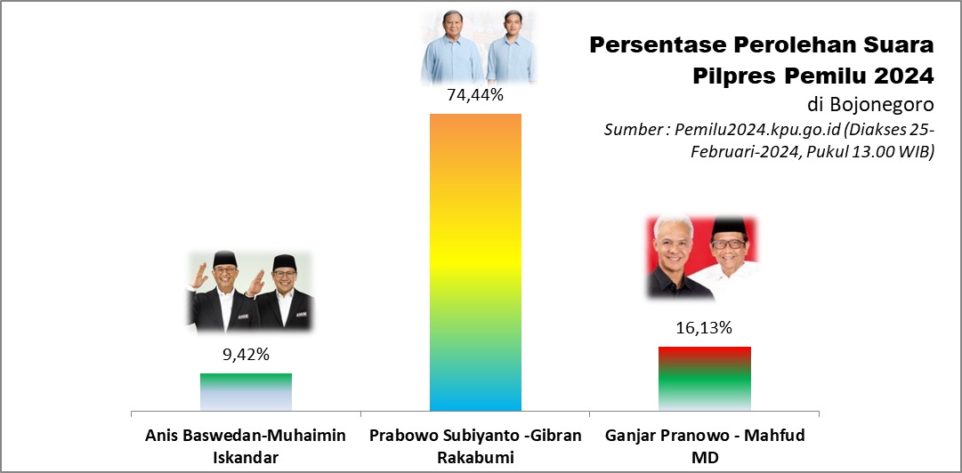 Berdasar laman tersebut per 25-Februari-2024, jumlah data masuk untuk Pilpres di Bojonegoro mencapai 90,86 persen, dari 4.278 Tempat Pemungutan Sura (TPS) telah terkumpul 3.887 TPS.