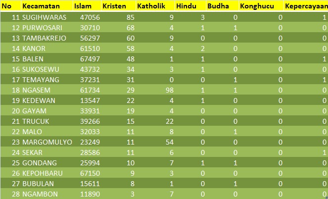 Di mana ya Umat Kristiani Terbanyak di Bojonegoro? 9 Desember 2022oleh Redaksi 433 Dilihatoleh Redaksi (Ilustrasi) (Tabel Jumlah Pemeluk Agama dan Aliran Kepercayaan di Bojonegoro tahun 2023. ) Penulis : Syafik Laman sebelumnya Halaman: 1 2Baca Juga : Rangking Perguruan Tinggi di Bojonegoro Versi Webometrics. Siapakah yang Paling Unggul? Berita Terkait“Rekayasa” Pemberitaan vs Realitas Data: Pesantren adalah Pilar Utama Pendidikan IndonesiaSekretaris DPC PKB Bojonegoro Abdulloh Umar: Tayangan Trans7 Cederai Marwah Kiai dan PesantrenJejak Pendidikan di Peta Kemiskinan: Data Terbaru Bojonegoro 2025Jejak Sekolah di Balik Kemiskinan: Potret Pendidikan dan Kemiskinan Bojonegoro di Jawa TimurSunan Bejagung: Wali dari Champa yang Menyebarkan Islam di Tuban