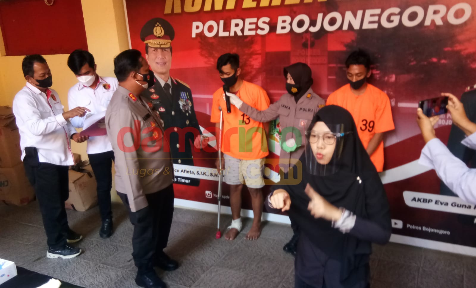 Bojonegoro, damarinfo.com – Dua tersangka kasus pencurian dengan kekerasan (curas) terpaksa ditembak kakinya oleh tim Reserse Mobile (Resmob) Polres Bojonegoro, Senin 6-September-2021. Dua tersangka pelaku, berinisial DA dan FL, dikenal raja tega karena saat melakukan tindak kejahatan ada salah satu korban meninggal usai dianiaya.