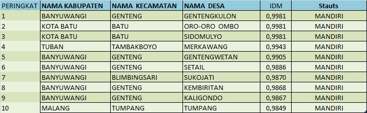 Berikut 30 Desa dengan nilai IDM desa teringgi di Jawa Timur dari yang paling tinggi pada tahun 2022;