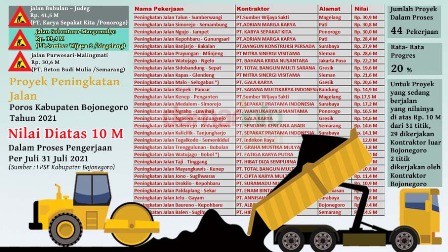 Data dari lpse.bojonegorokab.go.id (diakses pada tanggal 29-Juli-2021) menunjukan dari 31 pekerjaan peningkatan jalan poros kabupaten Bojonegoro yang sedang dalam pengerjaan, 29 proyeknya dikerjakan kontraktor dari luar Bojonegoro, bahkan satu kontraktor bisa mendapatkan tiga proyek sekaligus, sementara kontraktor lokal hanya mengerjakan dua pekerjaan.