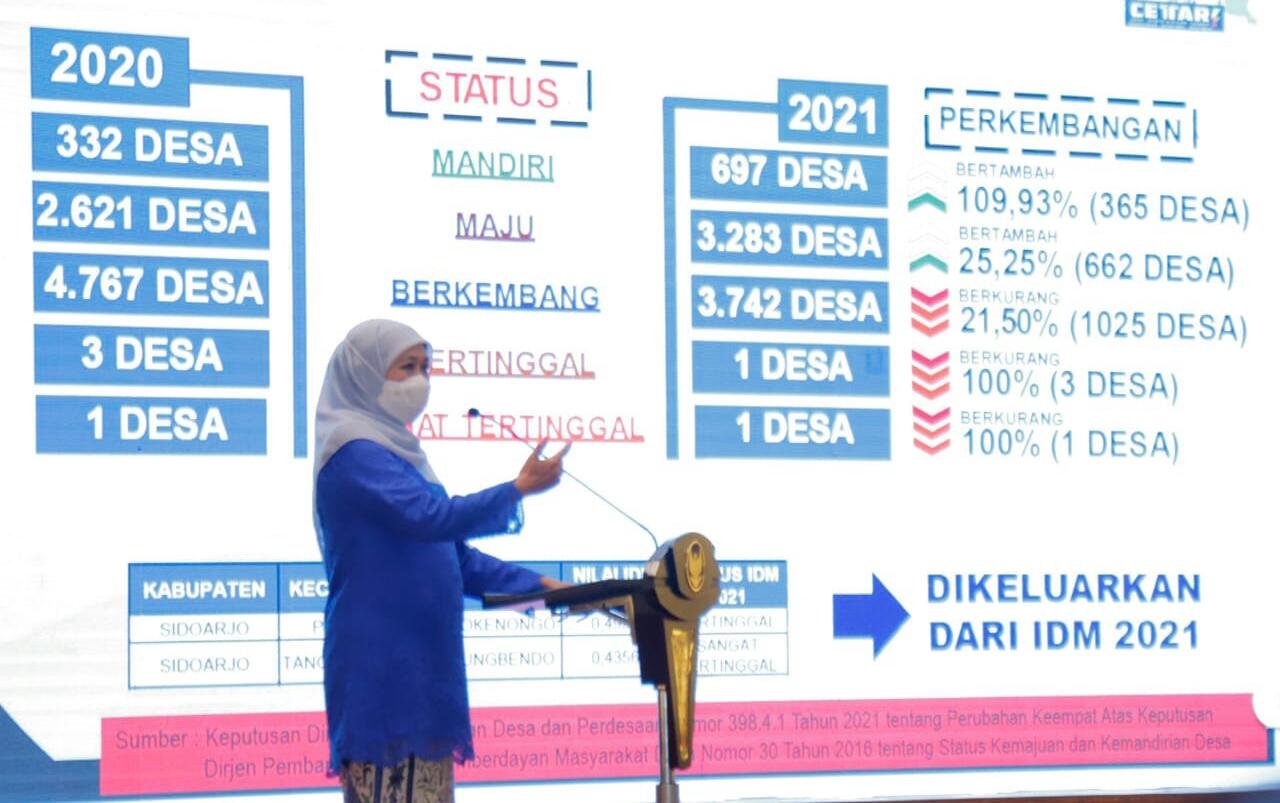 Khofifah menjelaskan lebih jauh, bahwa bebas desa tertinggal ini berarti desa-desa di Jatim relatif mulai menuju mandiri dan sejahtera. Yang mana, hal itu diukur dari kecukupan infrastruktur, elektrifikasi, dan pendidikan yang ada di desa-desa.