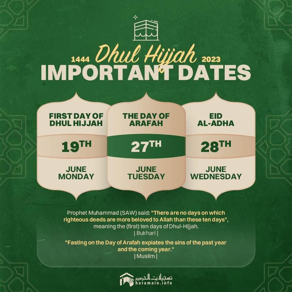 Berdasar rilis yang diterbitkan oleh Kelompok Bimbingan Ibadah Haji dan Umroh (KBIHU) Masyarakat madani milik Pengurus Daerah Muhammadiyah (PDM) Bojonegoro, Koordinator Rombongan (Karom) KBIHU masyarakat madani Suyitno yang sudah berada di Arab Saudi, menyampaikan bahwa Kerajaan Arab Saudi, melalui rukyat, menetapkan tanggal 1 Dzulhijjah 1444 H. bertepatan dengan hari Senin 19 Juni 2023, sehingga puncak ibadah haji wukuf di Padang Arafah akan dilaksanakan pada 9 Dzulhijjah 1444 yang bertepatan Selasa 27 Juni 2023. Artinya, Idul Adha di sana (10 Dzulhijjah) jatuh pada hari Rabu 28 Juni 2023.