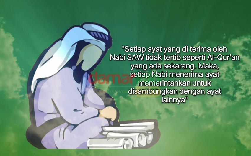 Selain itu, setiap ayat yang di terima oleh Nabi Muhammad SAW tidak tertib seperti Al-Qur’an yang ada sekarang. Maka, setiap Nabi menerima ayat memerintahkan untuk disambungkan dengan ayat yang lain. Jadi ayat Al-Qur’an yang ada saat ini sudah diurutkan dan di atur langsung oleh Nabi Muhammad SAW.