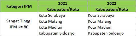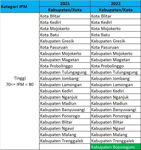 Pada tahun 2022 dari 13 Kabupaten/Kota yang IPM-nya dikategorikan sedang, hanya Kabupaten Bojonegoro naik kategorinya menjadi tinggi karena nilai IPM-nya di atas 70 tepatnya 70,12. Sehingga jumlah Kabupaten/kota yang IPM nya dikategorikan tinggi berjumlah 22. Dan untuk IPM dengan kategori sedang berkurang menjadi tinggal 12 Kabupaten/Kota.