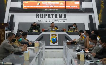 Damarinfo-Bojonegoro. Kepolisian Resor Bojonegoro menggelar rapat koordinasi (rakor) dengan tema Antisipasi Kerumunan Jelang Idul Fitri 1442 H di masa pandemi Covid-19 di Gedung AP I Rawi Polres Bojonegoro, Selasa 4-Mei-2021. Rapat koordinasi melibatkan Forum Koordinasi Pimpinan Daerah (Forkopimda) dan lintas sektor lainnya.
