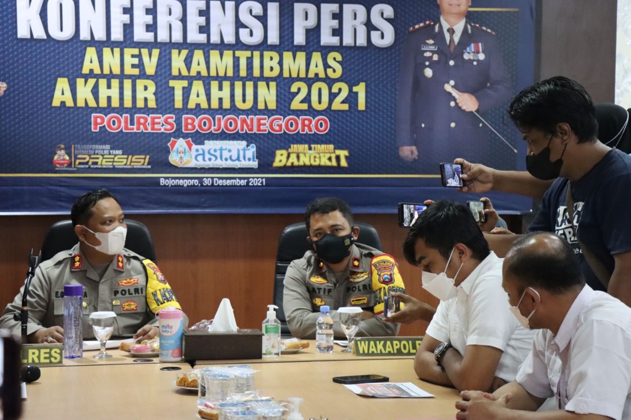 Kapolres Bojonegoro mengatakan tahun 2021 jumlah tindak pidana yang ditangani Sat Reskrim Polres Bojonegoro mengalami penurunan 30 kasus. Perbandingan dari tahun 2020 sejumlah 578 kasus sedangkan di tahun 2021 sejumlah 508 kasus.