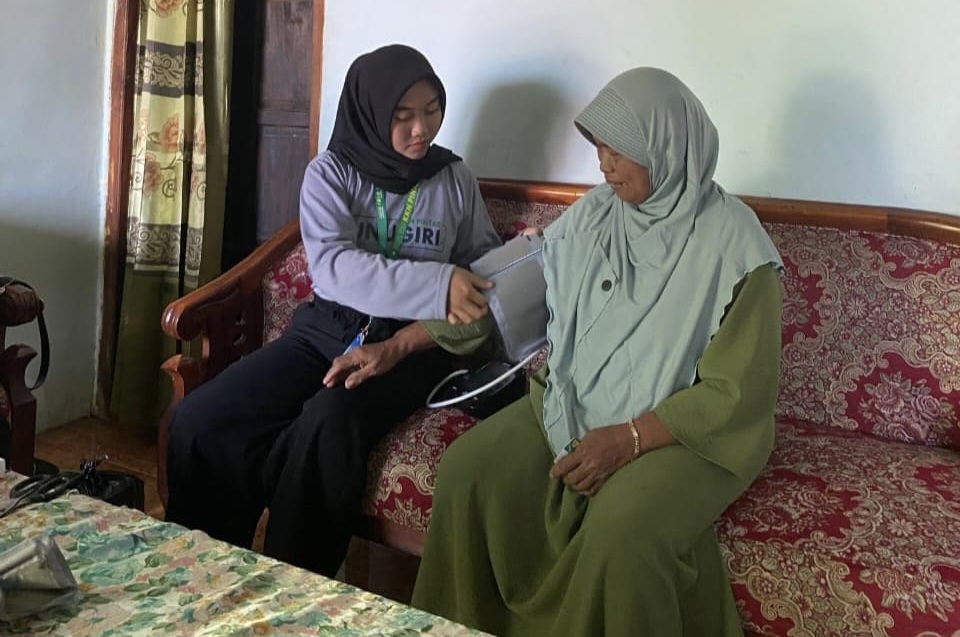 Tidak hanya fokus pada anak-anak, kegiatan ini juga menjadi momen penting bagi lansia untuk memeriksakan kondisi kesehatan. Saat kegiatan berlangsung, tampak tim KKN kelompok 15 Unugiri sedang melakukan pengukuran tekanan darah lansia sebagai upaya pencegahan penyakit tidak menular.