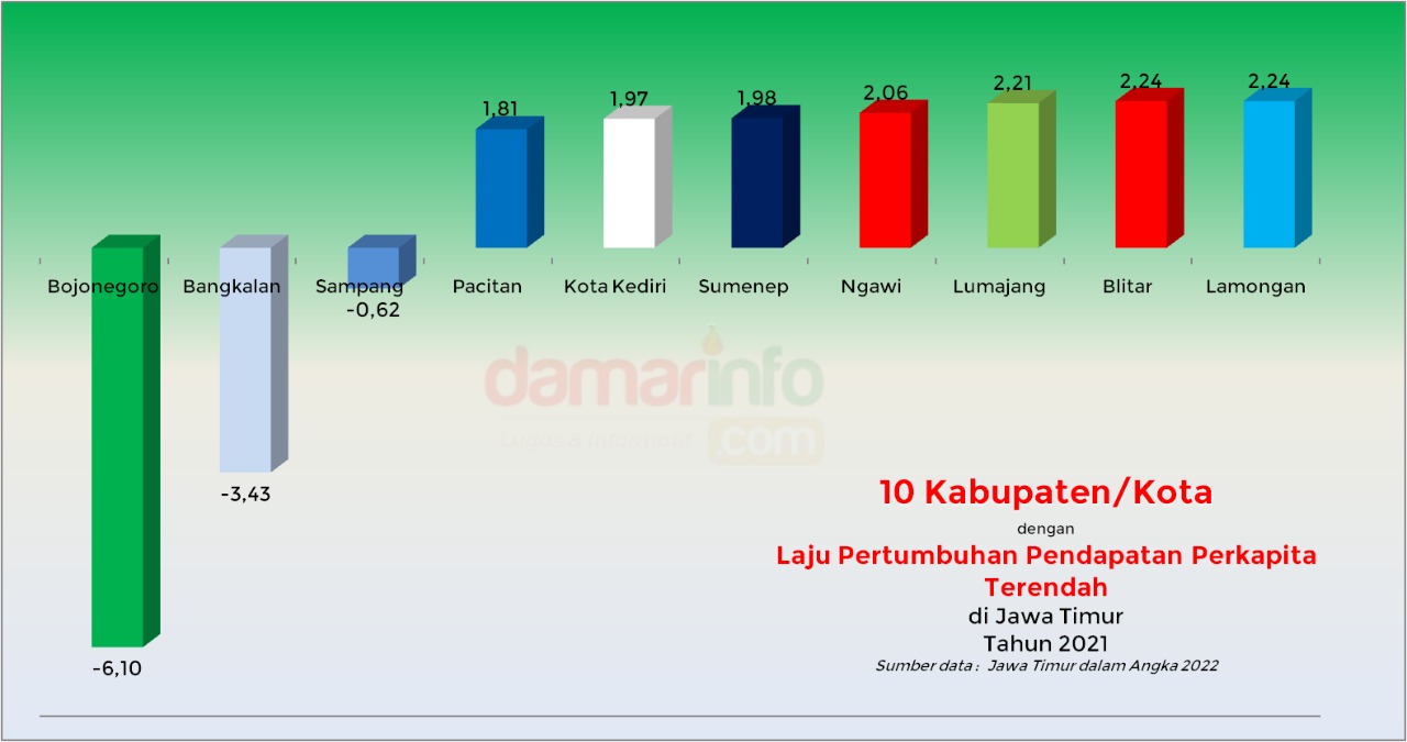 Bojonegoro, damarinfo.com – Kabupaten Bojonegoro pada tahun 2021 menempati urutan terendah dari 38 Kabupaten/Kota se Jawa Timur. Setidaknya jika dipotret dari Laju Pertumbuhan Pendapatan Domestik Regional Bruto (PDRB) per Kapita atau biasa disebut Pendapatan Per kapita yakni sebesar – 6,1 persen.