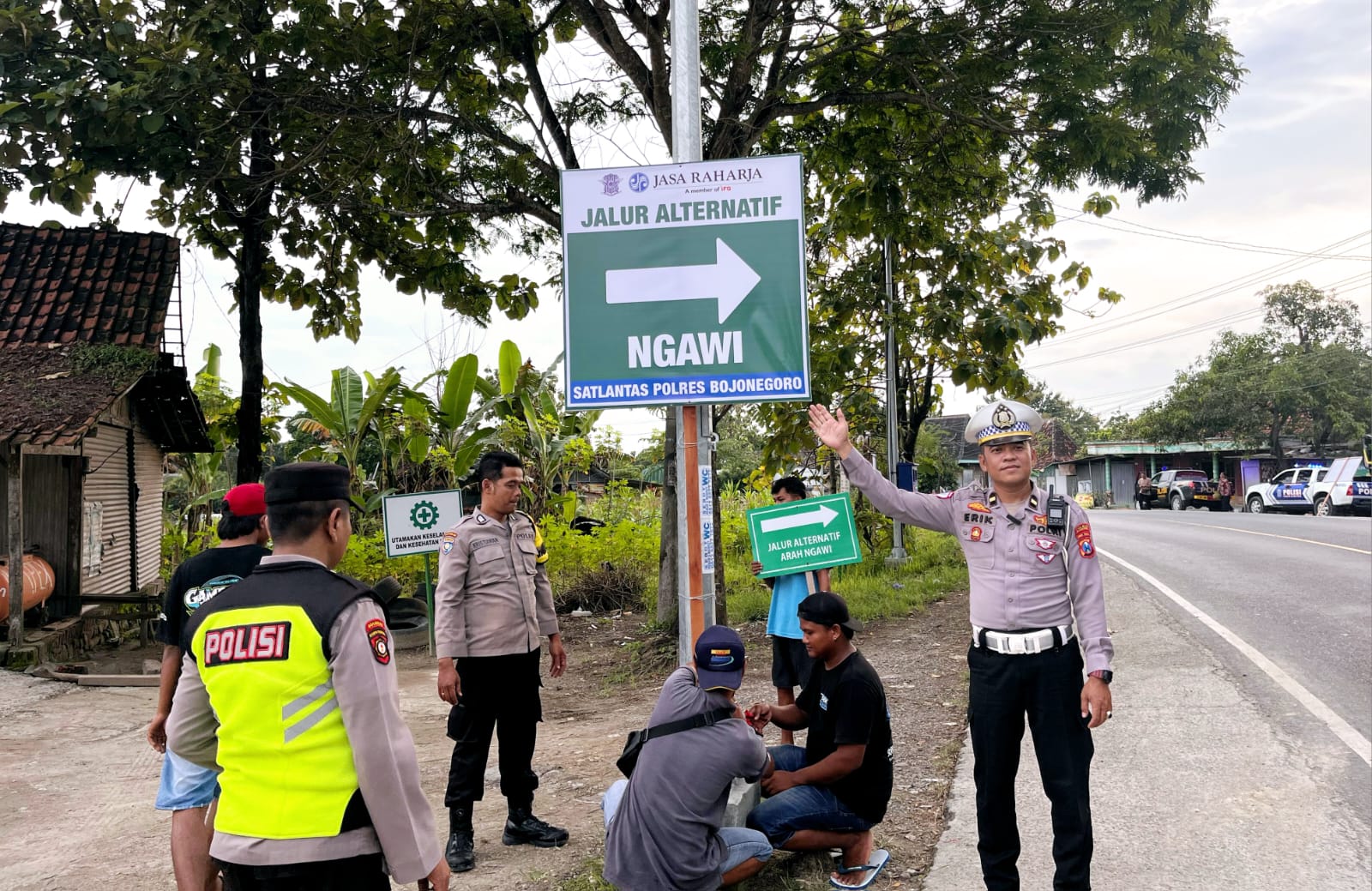 “Pemasangan rambu penunjuk arah guna antisipasi kepadatan arus mudik dan balik hari raya idul fitri 1446 H pada jalur Ngawi Padangan,” ungkap Kasatlantas Polres Bojonegoro AKP Deni Eko Presetyo.