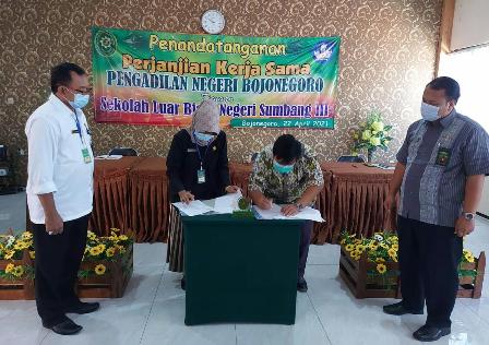 Damarinfo-Bojonegoro – Pengadilan Negeri (PN) Bojonegoro melakukan penandatanganan nota kesepahaman MoU dengan Sekolah Luar Biasa (SLB) Negeri III Sumbang di Kantor PN Bojonegoro, Kamis, 22-4-2021. Kesepakatan ini terkait dengan layanan disabilitas di lingkungan kantor PN Bojonegoro.