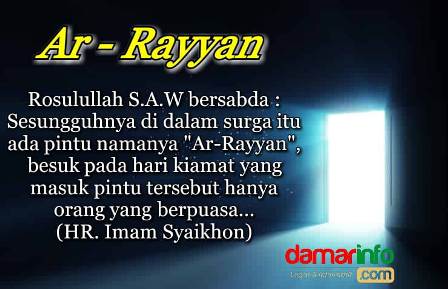 Sabda Rosulullah S.A.W yang lain yang diriwayatkan Imam Syaikhon, sesungguhnya di surga itu ada pintu yang namanya Ar Rayyan. Nanti, jika hari kiamat datang, yang akan masuk ke pintu tersebut hanya khusus orang yang menunaikan ibadah puasa. Tepatnya saat diundang atau diumumkan, mana-mana orang yang telah berpuasa. Orang yang semasa hidupunya telah berpuasa, maka mereka bangun semua dan memasuki surga dari pintu tersebut. Tatkala orang-orang tersebut telah memasuki pintu surga itu, maka pintu menjadi tertutup dan tidak ada yang bisa masuk.