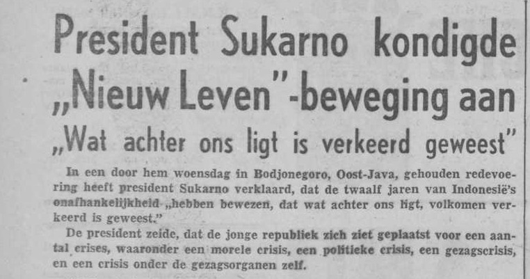 Dengan sub judul “Dalam pidato yang disampaikannya pada hari Rabu di Bodjonegoro , Jawa Timur, Presiden Sukarno menyatakan bahwa dua belas tahun kemerdekaan Indonesia “membuktikan bahwa apa yang ada di belakang kita benar-benar salah.” Presiden mengatakan republik muda ini menghadapi sejumlah krisis, termasuk krisis moral, krisis politik, krisis otoritas, dan krisis di antara penguasa itu sendiri.