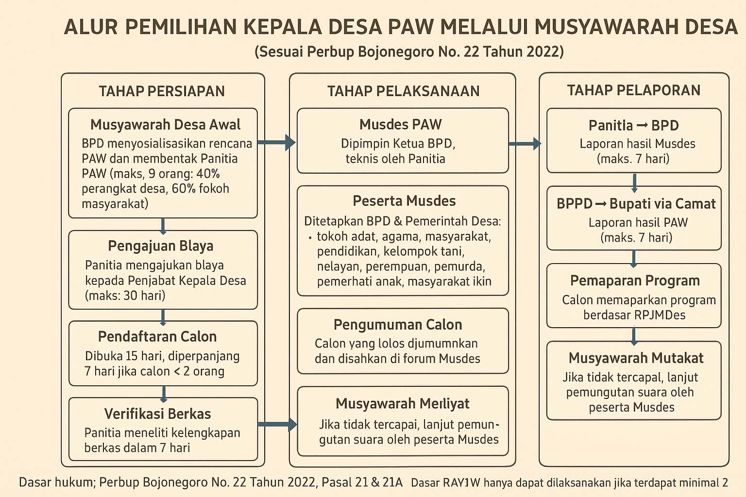Sebagai dasar pelaksanaan Pemilihan Kepala Desa PAW adalah Perbup Bojonegoro No. 22 Tahun 2022 (Perubahan Ketiga atas Perbup 29/2016) mengatur dua mekanisme sesuai sisa masa jabatan (Pasal 21):