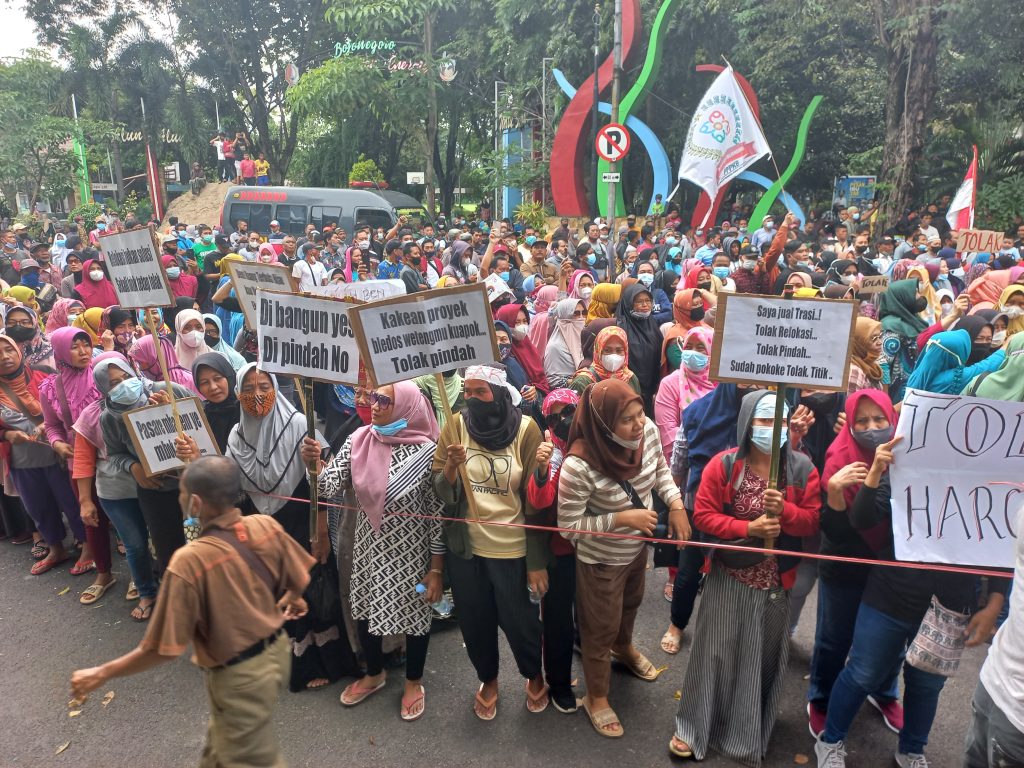Bojonegoro,damarinfo.com – Ratusan Pedagang Pasar Kota Bojonegoro kembali unjuk rasa di depan gedung Pemerintah Kabupaten Bojonegoro untuk menolak relokasi pasar, Jumat 1-1-2022.