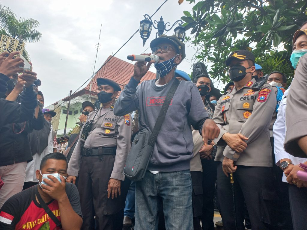 Sesampainya di depan pintu gerbang gedung Pemkab Bojonegoro para pengunjuk rasa bergiliran ber orasi. Para pengunjuk rasa yang melakukan orasi semuanya menyampaikan penolakan rekolasi pedagang pasar kota ke pasar wisata.