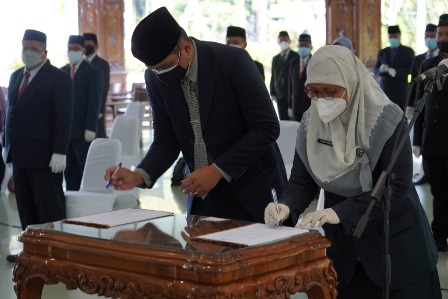 Damarinfo, Bojonegoro- Bupati Bojonegoro Anna Mu’anah melantik 132 pejabat dengan rincian 18 pejabat administrator, 6 pengawas dan 108 kepala sekolah Jumat 2-Juli-2021. Pelantikan di tiga tempat, yaitu di Pendopo Malowopati, ruang Partnership Room lantai 4 gedung Pemkab Bojonegoro serta Ruang Angling Dharma.