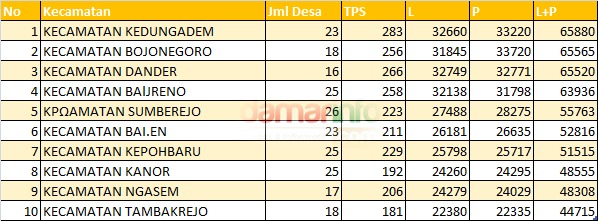 Di urutan kedua kecamatan dengan jumlah pemilih terbanyak adalah Kecamatan Bojonegoro dengan jumlah pemilih sebanyak 65.565 pemilih, terdiri dari 31.845 pemilih laki-laki dan 33.720 pemilih perempuan.